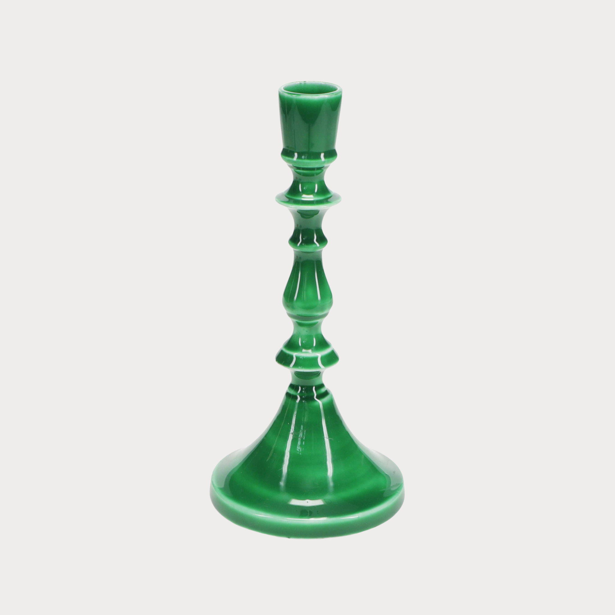 Cast-metal candlestick with a forest green enamel finish, elegant thin stem and round base.