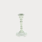 Cast-metal candlestick with a light grey enamel finish, elegant thin stem and octagonal base.